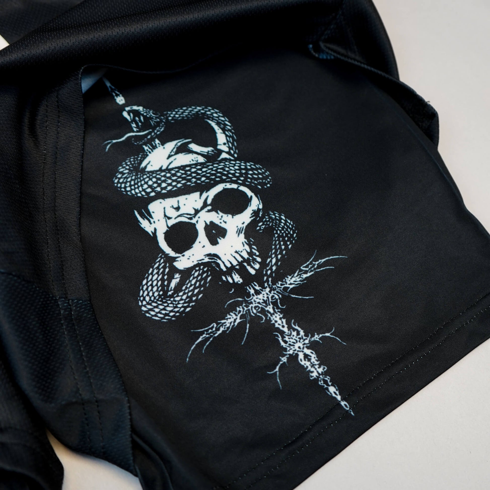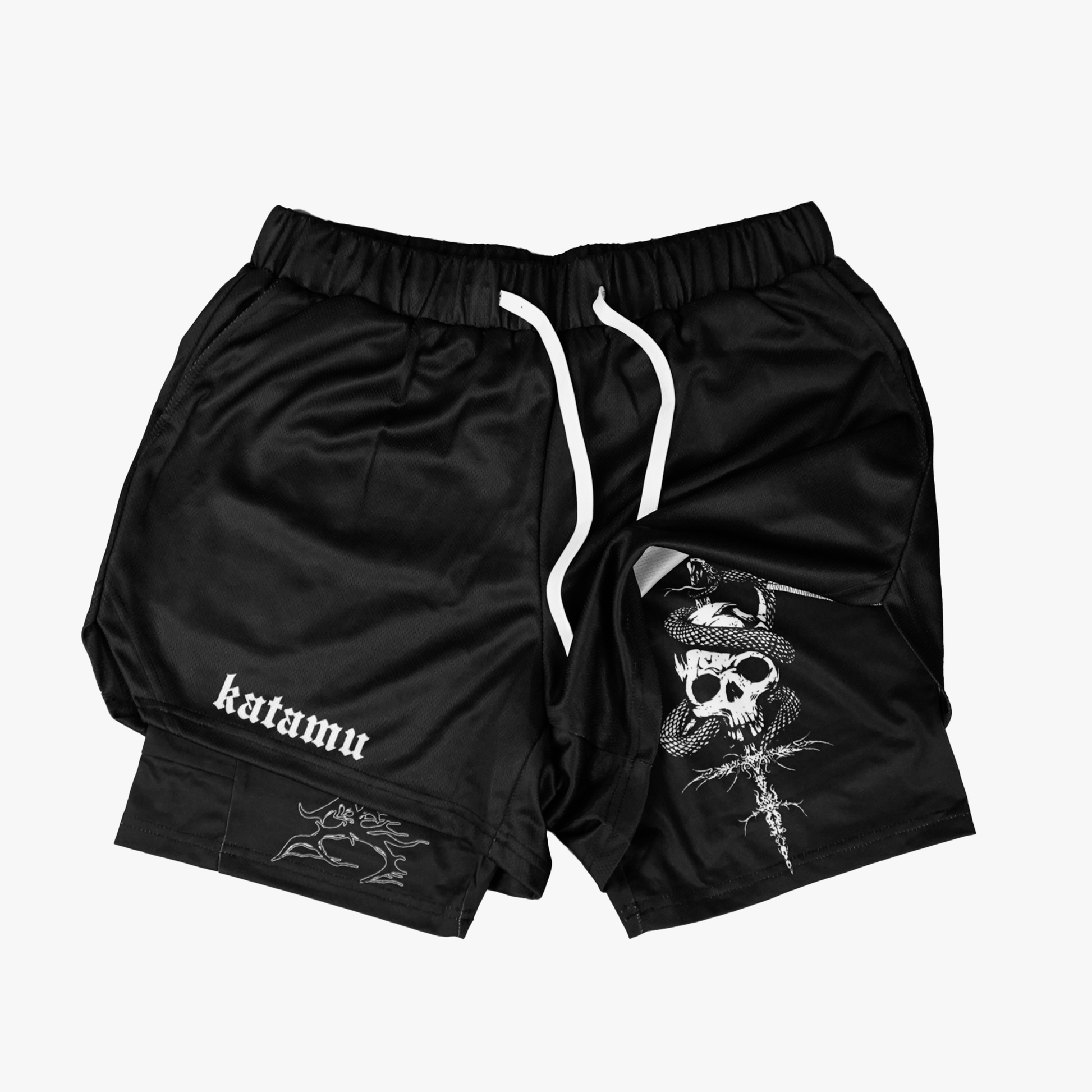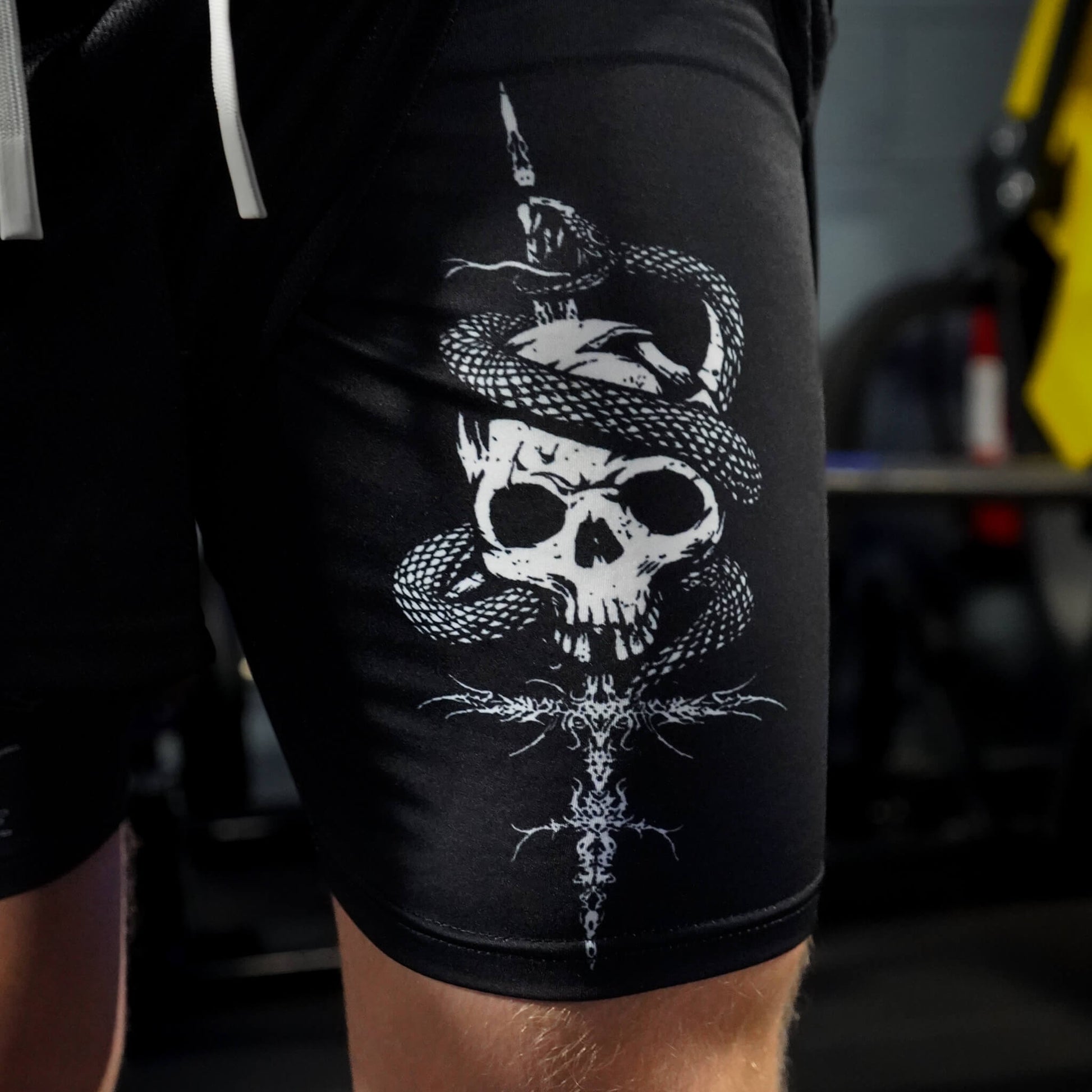 Push your limits with the Abyss Performance Shorts. Crafted from durable, lightweight fabric, these shorts offer unrestricted mobility for squats, deadlifts, or any intense workout session. The black design with white pierced skull complements your powerful training routine.